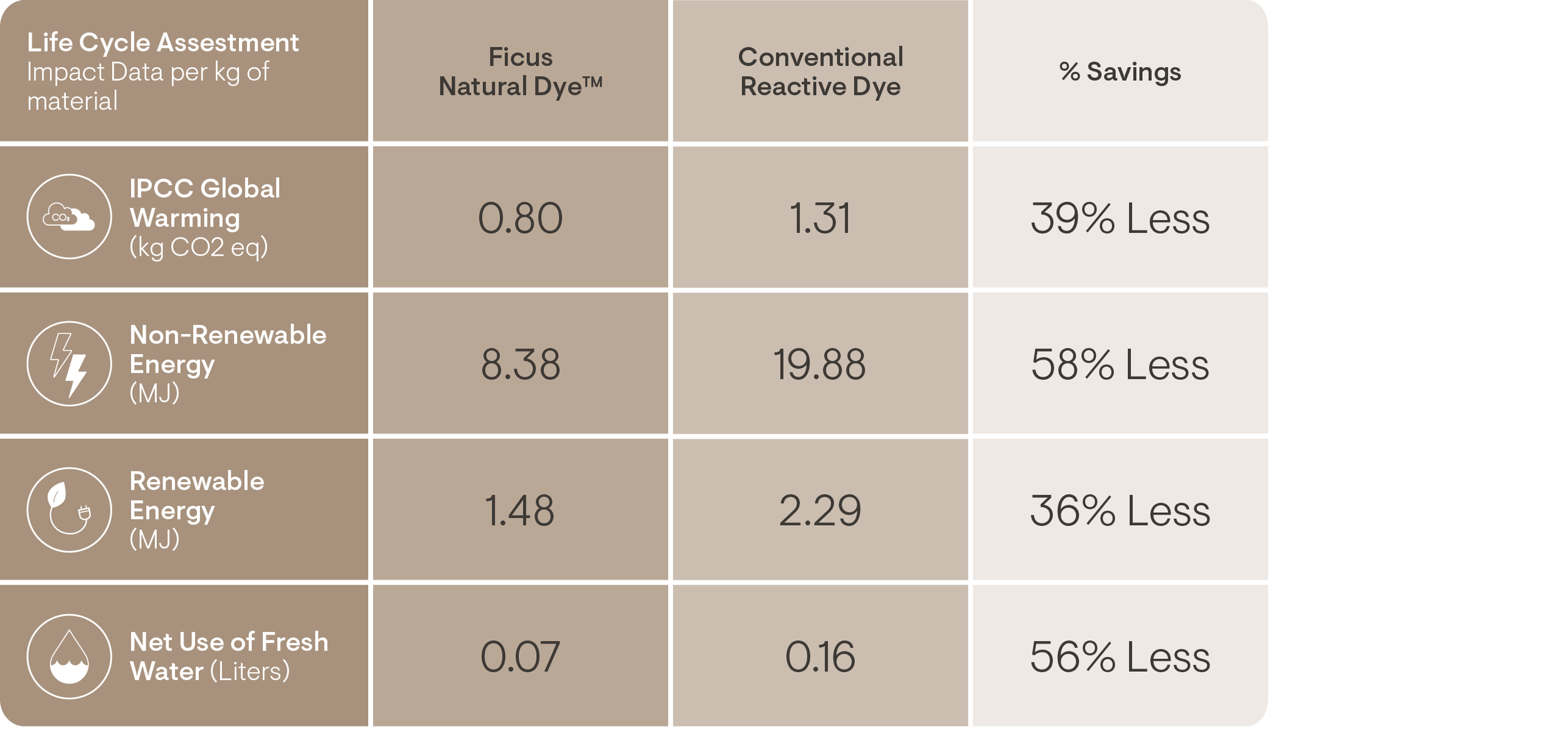 The following LCA (Life Cycle Assessment) data was conducted by third parties. The data come from two separate reports. One data set is for Agraloop™ CBD Hemp BioFibre™ DryRefined from fiber to gate. The second data set is for Ficus Innovation Natural Dye process. The data does not include the yarn spinning and fabric formation. LCA Reports and certifications are available upon request.